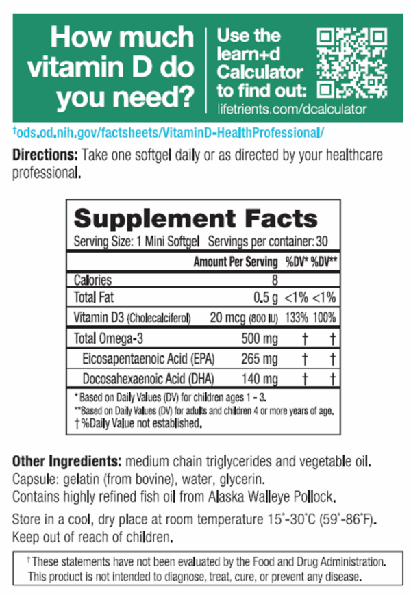 learn+d provides 100% of the RDI of vitamin d3 (800 i.u. / 20 mcg) for school-age children†, plus 500 mg omega3, essential nutrients to support the nutritional needs of school-age children 1-18 years.† While there is not a set RDI for Omega-3 EPA and DHA, these nutrients are essential for children, pregnant and breast-feeding mothers, and humans of all ages.